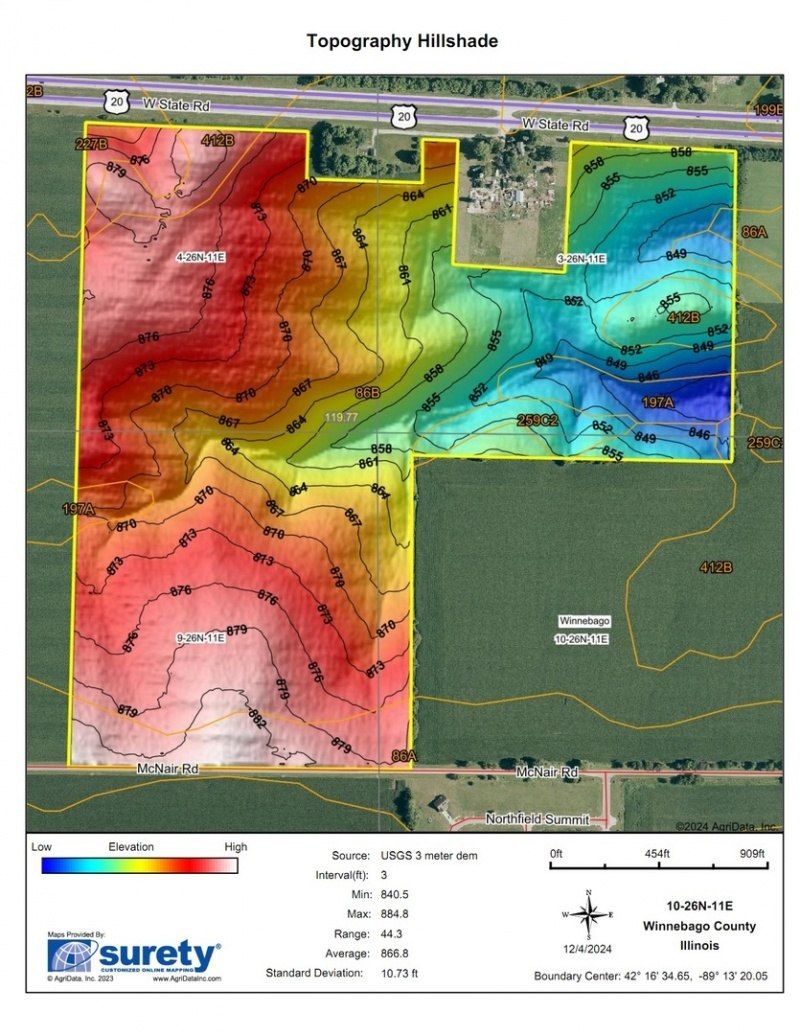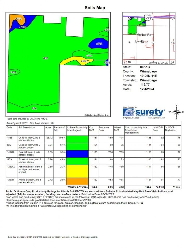 119.7 acres of Class A productive farmland with a PI rating of 136.9. This farm is nearly all tillable and there is a competitive cash rent lease in place for 2025. The predominant soil on this parcel is Osco Silt Loam. The farm is in a great location on the edge of Winnebago, just east of the High School on McNair Rd. City water and sewer is across the road from this parcel. Real Estate tax amount shown is for a larger parcel, taxes for the 119.7 acres only will be less. Asking 15,900/ac. An additional 80 acre parcel is also available to create a total of 199.72 acres. see MLS number 11638605.