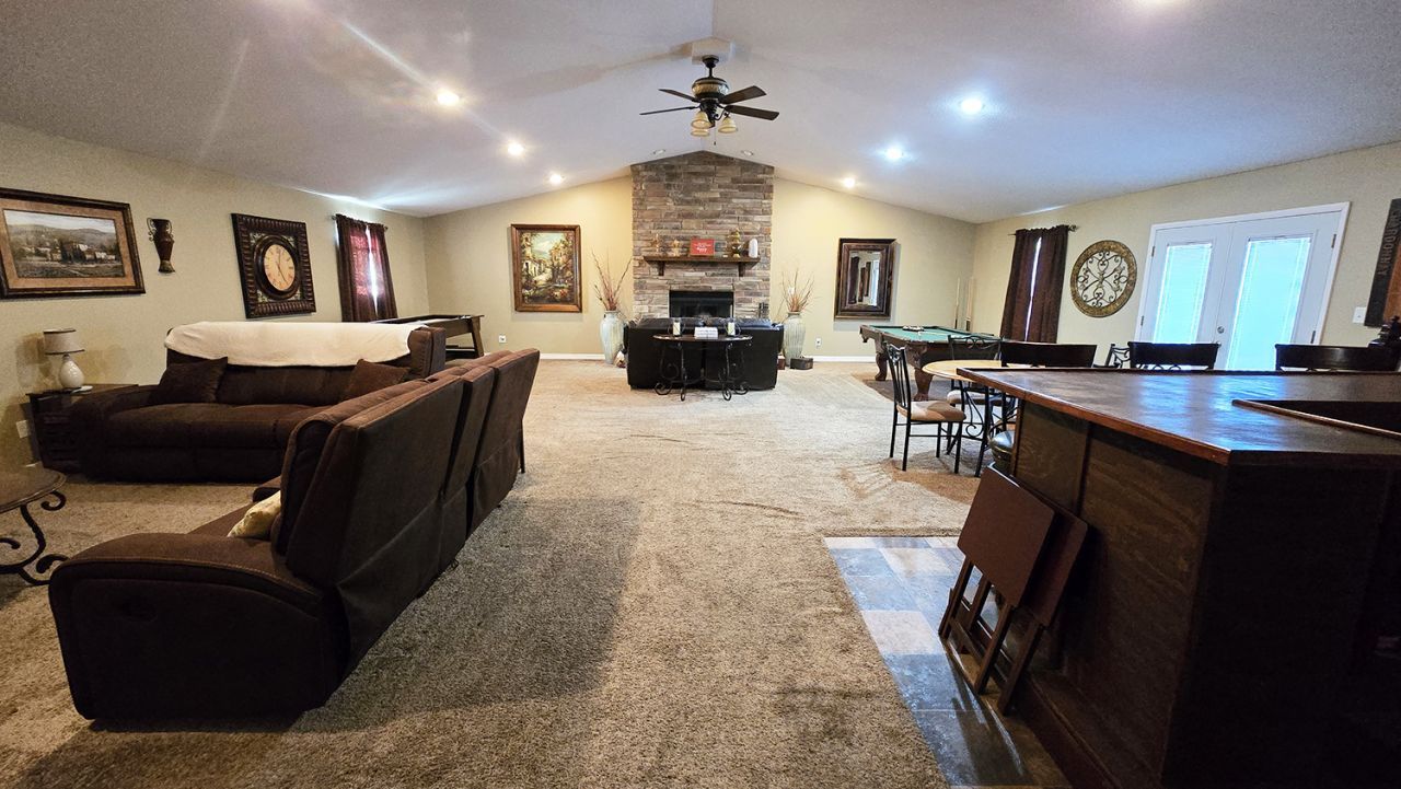 There is more to this home than meets the eye. Spacious living areas that include a formal dining room, a family room, and a great room that measures nearly 900 sf. There is a wood burning fireplace that provides a focal point to this spacious great room. The seller will be leaving the pool table, the bar and barstools, and bar refrigerator. The kitchen comes complete with all stainless steel appliances and has enough room for a table, if desired. There are 3 bedrooms and 1.5 bath. Washer and dryer will also remain.